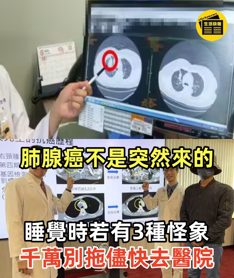 肺腺癌不是突然來的!睡覺時身體若有3種「怪象」,千萬別拖儘快去醫院,再不注意就晚了! 千萬別忽視!深夜3種身體異常竟可能被肺癌纏身,老年人必看,看完嚇一跳 日常生活中,很多人都習慣性地認為,癌症是突然降臨的,不聲不響便可奪走生命。 然而,這種想法其實低估了我們身體內部複雜的警報系