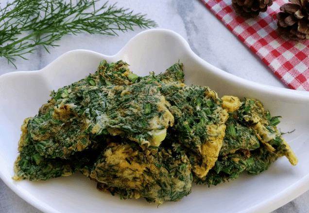 2、起鍋燒油,倒入茴香雞蛋液,大火煎至定型,放個面繼續煎,兩面都金黃後炒成大塊即可。