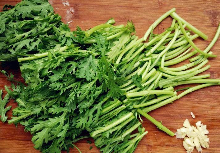 準備茼蒿、蒜瓣、食鹽、食用油、生抽。