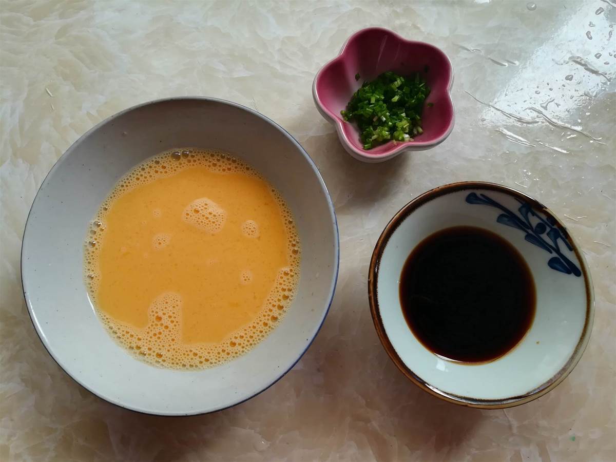 第二步:雞蛋去殼打散,蔥花清洗干凈,葉子部分切成小段,生抽、水加白砂糖攪拌均勻調成汁備用。