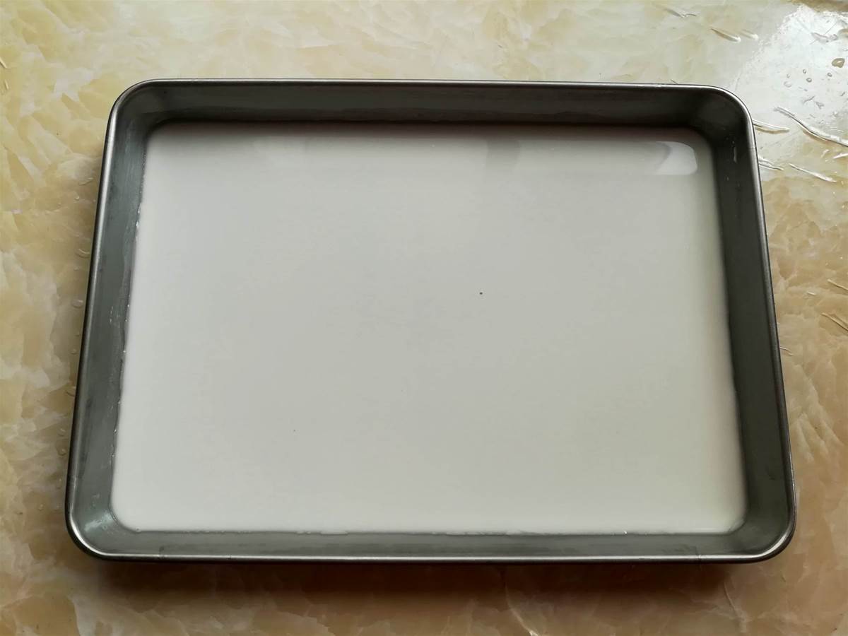 第一步:腸粉預拌粉和水按照1比3放入盆子里,攪拌成沒有干粉和顆粒物的腸粉面漿。如果想要口感Q一點的,可以把比例調整為1比2.5。這個時候去燒一鍋熱開水。