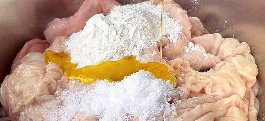 比如加點淀粉跟鹽,淀粉可以吸附大腸表面的雜質,鹽同樣有這樣的效果, 大部分朋友都會用這個方法來制作,方便快捷,洗的也干凈。