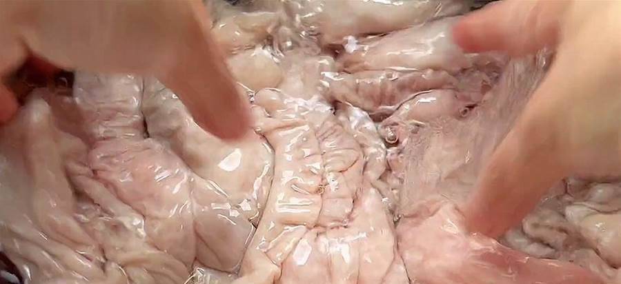 3.接著把它翻過來,腸壁里面的脂肪撕掉。