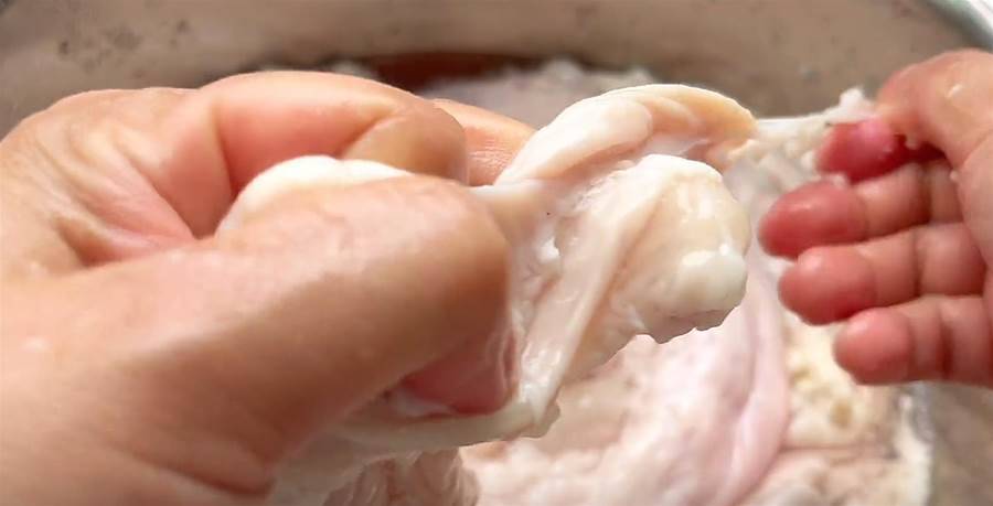 2.抓到黏膩用水沖一下,然后再加入粉、鹽去抓,重復兩到三次。