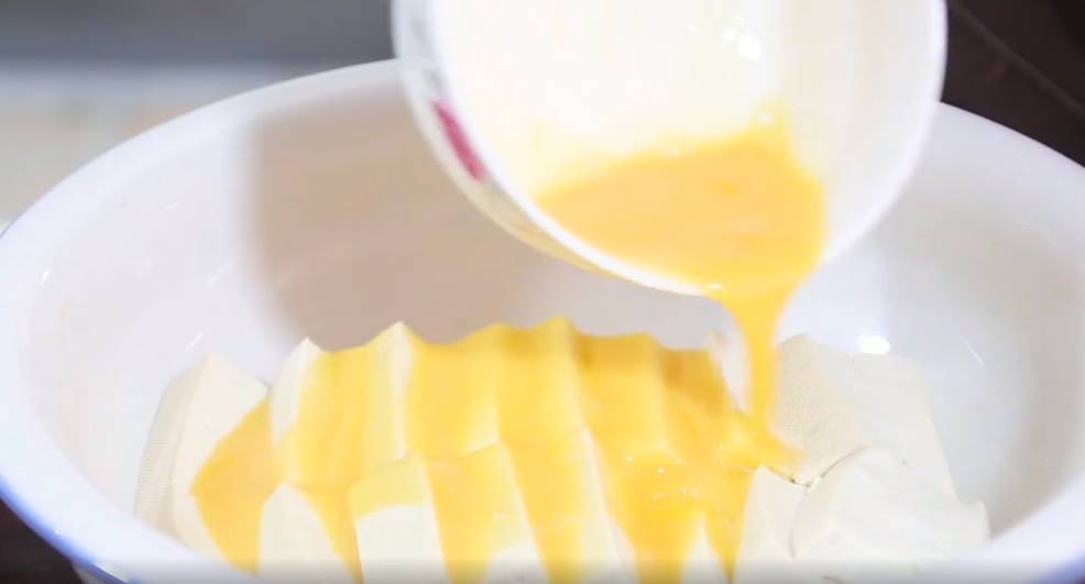 6.將雞蛋液慢慢地淋入豆腐里,晃一下,讓豆腐充分裹上雞蛋液。