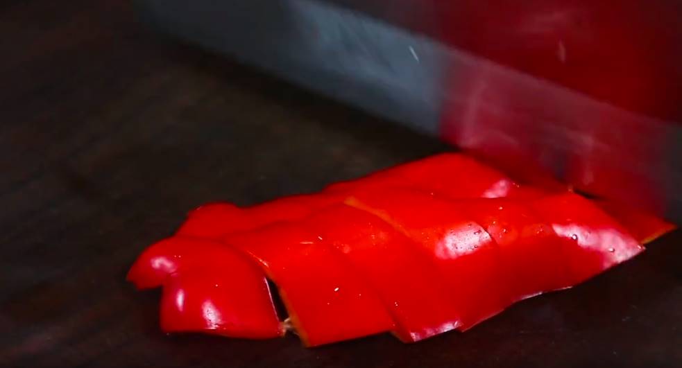 5.蔥葉切段,蔥白切成蔥花。一根紅椒去籽,切成斜片。一根青椒同樣的處理方法。