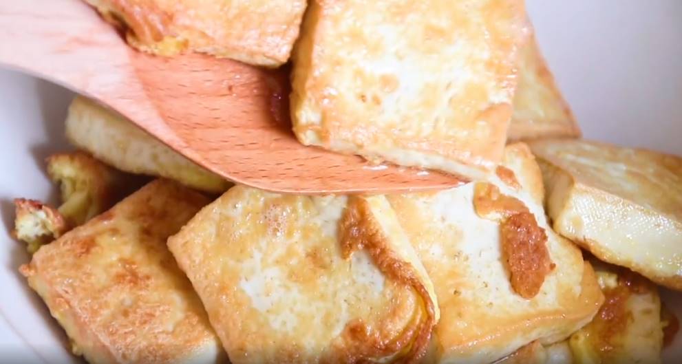 3.煎豆腐的時候一定要勤翻面,讓雞蛋和豆腐受熱均勻。開始一定要等到豆腐定型后再翻面,否則豆腐容易開裂。
