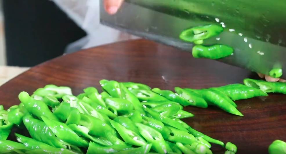 2.把辣椒切成斜段,這里我們一般選用新鮮的青椒,口感比較好。