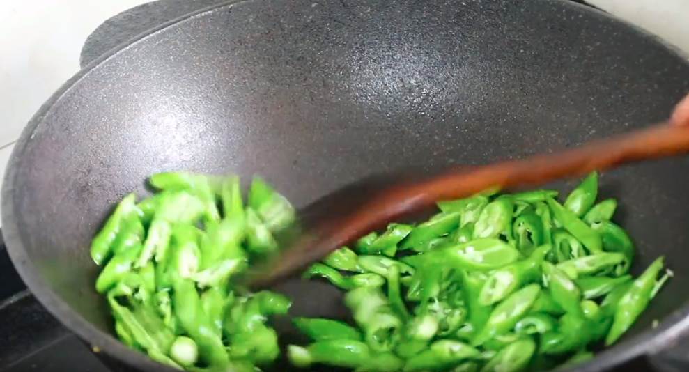4.給辣椒里加入一點食鹽,繼續翻炒,辣椒炒到微微斷生,看起來表皮有點發蔫就可以了。