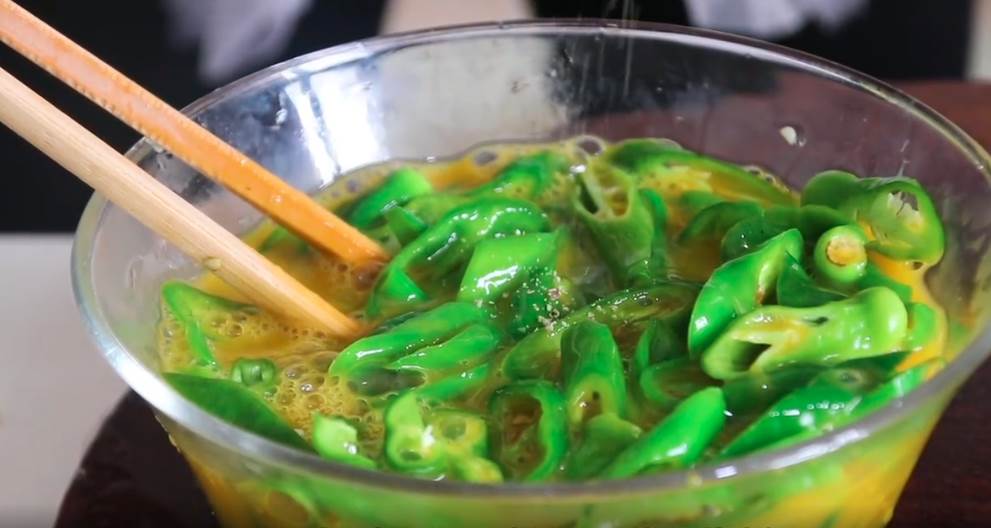 5.炒好的辣椒直接倒進蛋液里,給它充分攪勻,讓雞蛋和辣椒充分混合。接著撒點胡椒粉,可以去掉雞蛋的腥味。不過如果覺得不喜歡胡椒粉的辣味,也可以選擇不放。