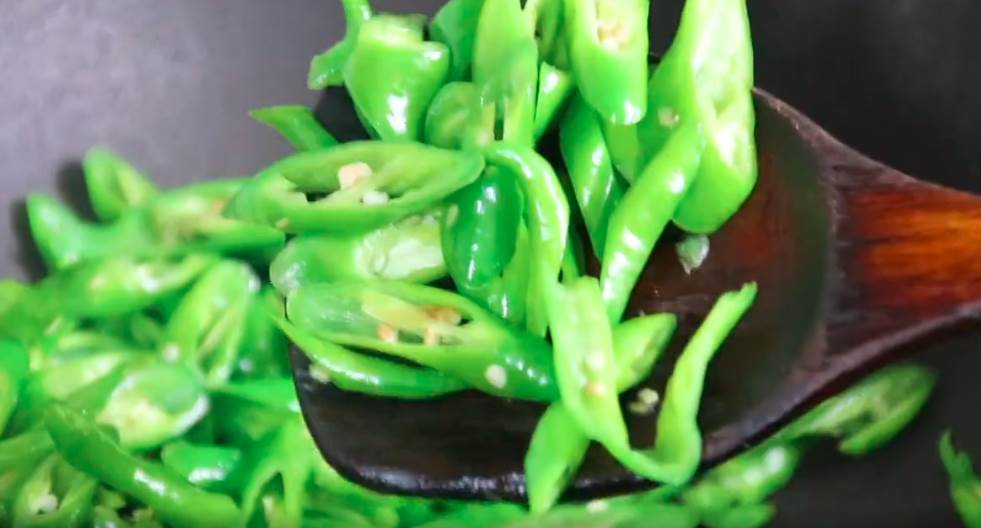 2.青椒提前在鍋里煎焙一下,這樣能釋放出辣椒的香味,吃起來口感非常的不錯,也是這道菜與眾不同的關鍵。