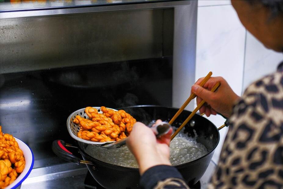 5、起鍋燒油,油熱之后把麻花放進去,用小火開始炸,炸到金黃之后先撈出來一個嘗嘗看,如果覺得可以了,非常酥脆了的話,全部撈出來控干油分,晾涼以后開吃。