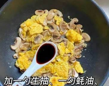 加入一勺生抽、一勺蠔油和適量的鹽,調味翻炒均勻。這里調味料的加入要適量,生抽和蠔油能很好地提升鮮味,但不宜過多,以免搶掉口蘑和雞蛋的原味 。