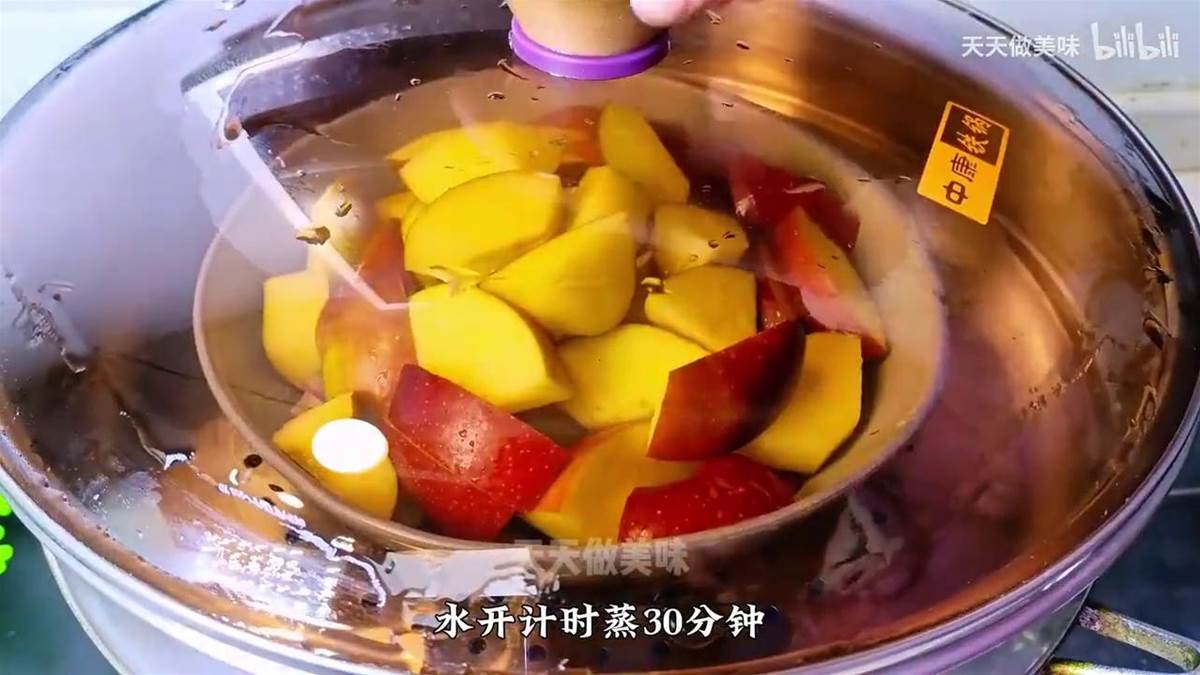 ·然後把蘋果直接放入蒸鍋中,扣上蓋子,水開計時蒸30分鐘,把蘋果以及其他食材的營養全部蒸出來。