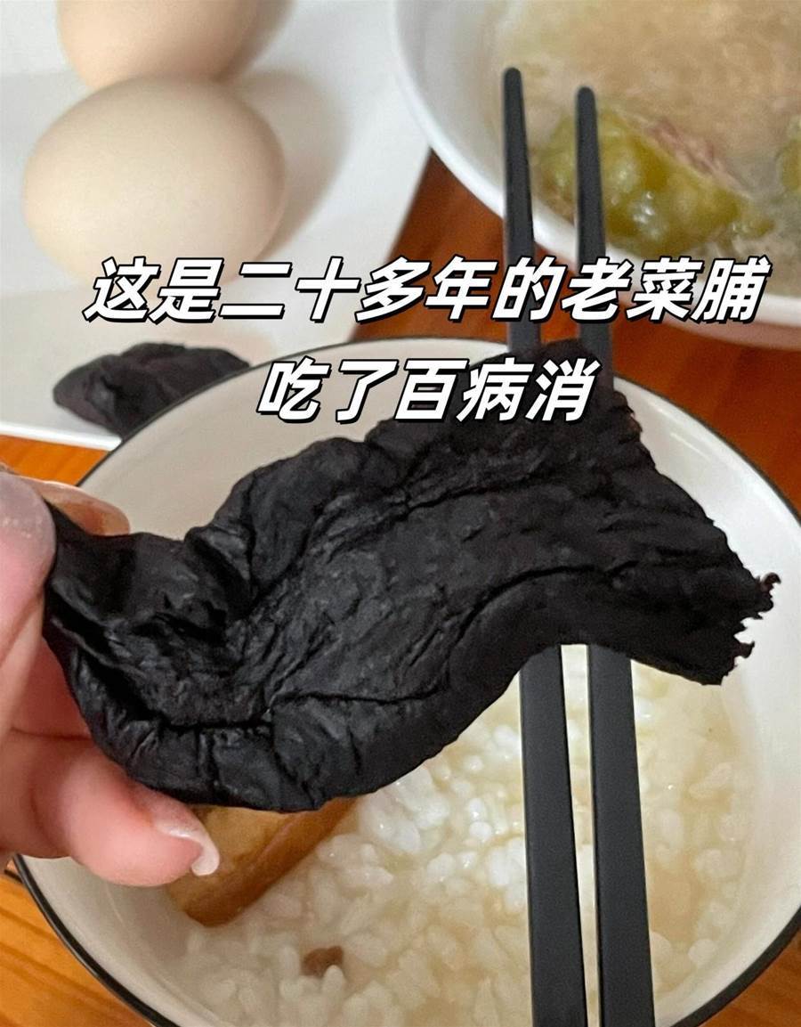 有位朋友說家里有一小缸老菜脯,放了35年了,從他出生前就有了,搬了幾次家都帶著,現在缸里的菜脯已經變成墨黑色,出油,軟綿,香味濃厚,配白粥很好吃。