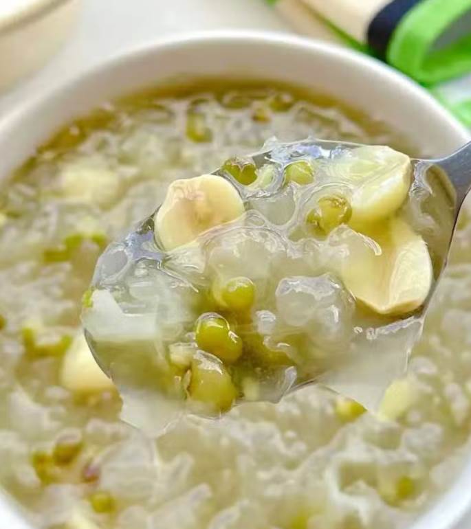 蓮子綠豆加水煮20分鐘2.再倒入銀耳,冰糖繼續熬煮15分鐘3.過程中多加攪拌,銀耳會更出膠