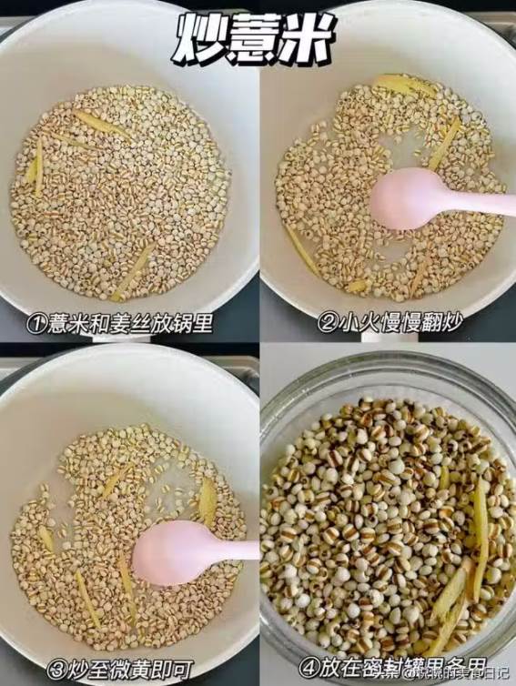 薏米如果直接煲水喝是比較寒的,而且去濕的效果也沒有那麼好。薏米清洗乾淨後放入鍋中炒干水分,再倒入薑絲小火慢慢翻炒。炒到薏米微微發黃卷邊,薑絲的水分變干就可以了,關火晾涼後裝入玻璃罐中保存。