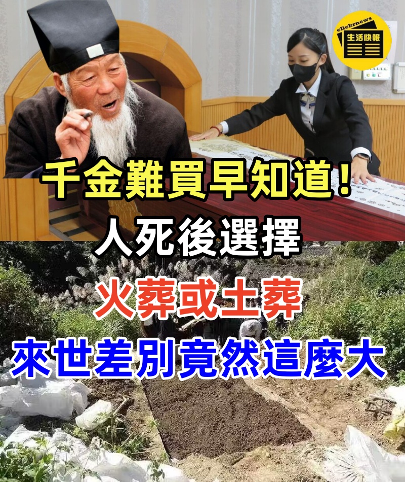 1/5 千金難買早知道!人死後,選擇火葬或土葬,來世的差別竟然這麼大! 現在,國家都在全面推行火葬。 在很多人的傳統觀念里,土葬流傳已久,深入人心。 但是火葬的推行,是一定有它的理由,對於火化,還有你不知道的真相在這。 生老病死,是自然規律,任何人都無法逃避。 無論你生
