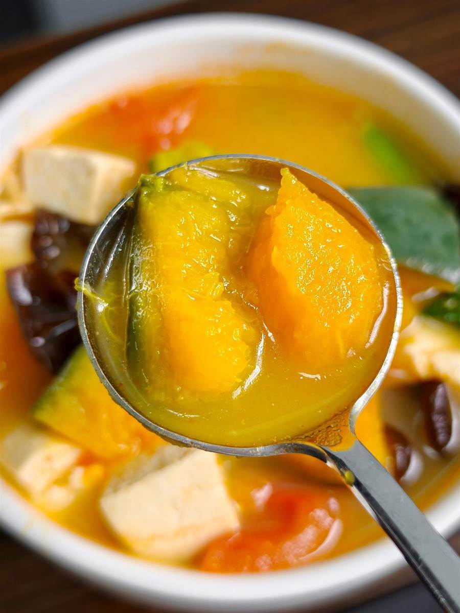 4. **煮湯**:加入清水或低鈉蔬菜湯,將所有食材完全覆蓋。煮沸后轉小火繼續熬煮約15分鐘,使南瓜變軟湯汁濃郁。