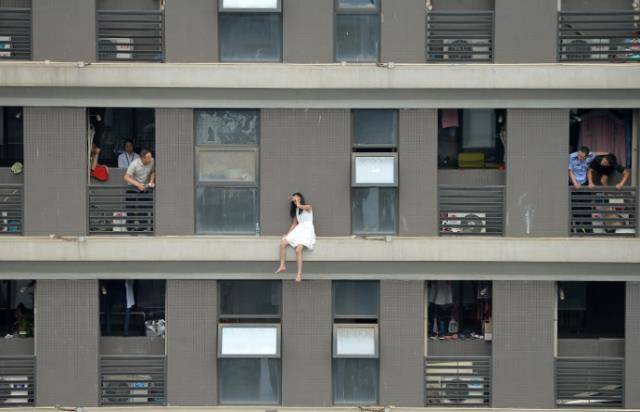 在醫院窗台上,一名女子坐在樓房邊緣上,感覺隨時都要跳下來,一時間,樓下圍了一堆人,醫院領導見狀立即叫來消防隊,支起了氣墊。