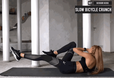 動作頂點稍停,感受下腹部肌肉的充分收縮,然后控制速度慢慢還原