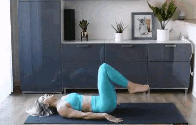 仰臥在瑜伽墊上,上半身貼地,雙手置于耳旁,雙腿屈膝并攏,雙腳腳跟踩地