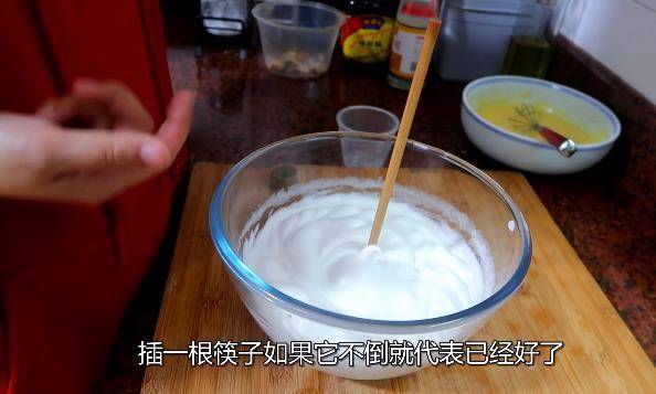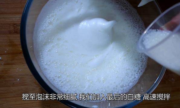 6。打成泡沫比較細膩的時候我們倒入剩下的白糖,用高速打發大概5分鐘左右。