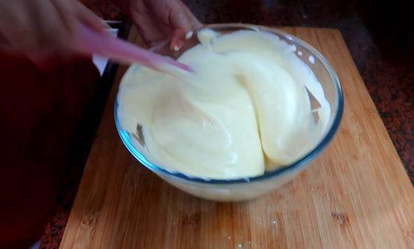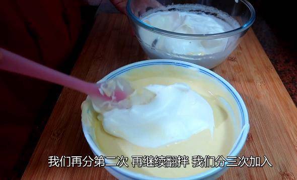 8.先倒出三分之一的蛋清至蛋糊中,用炒菜的方式翻拌,不要打圈圈,容易消泡,這個過程我們盡量快一些。然后再倒入三分之一,持續剛才的動作。最后把剩下的蛋黃糊全部倒入,快速翻拌均勻