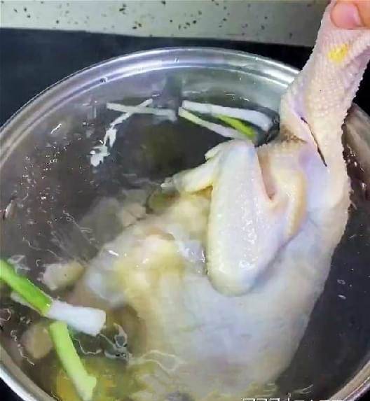 第二步:將火候改為小火,保證液面沒有大的沸騰,只是微微翻滾的程度最好,然后手提著雞頭,將整雞完全的浸泡入開水中,等待8秒鐘再提出,再浸入準備好的涼水中8秒鐘,按照這樣的步驟如此反復3次,注意浸入開水中時要輕輕的晃動一下整雞,使整雞內外受熱均勻。