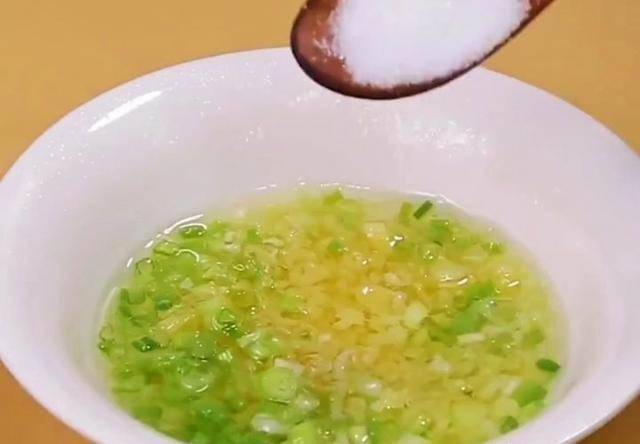 第五步:再來準備一點吃白切雞時所需的蘸料,生姜一塊拍碎,小蔥切碎和生姜一塊剁成茸,加入食鹽攪拌均勻,花生油燒熱后澆進去激發出香味即可。