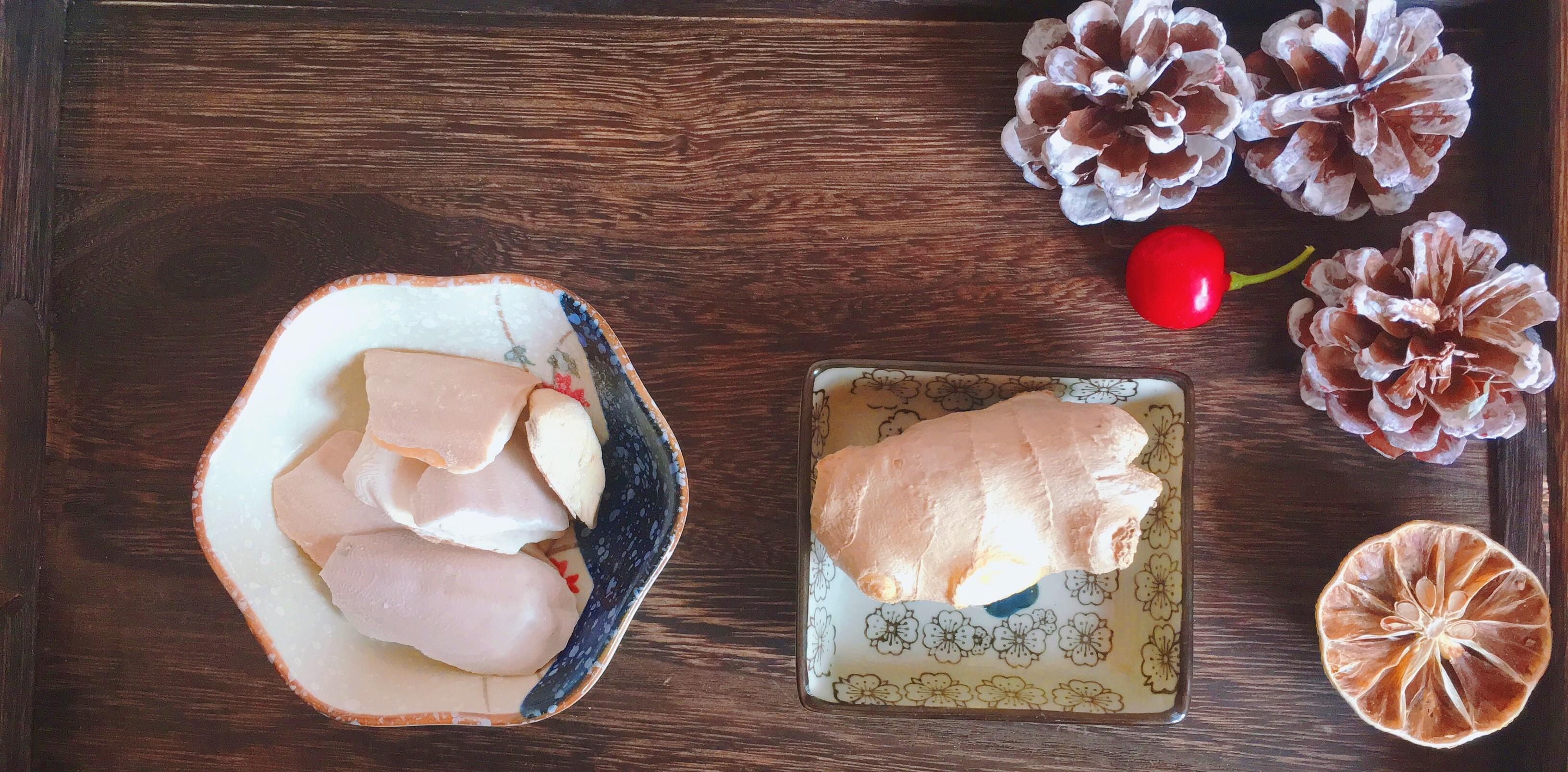 準備的兩至三人份食材:生薑15g,烏賊骨15g,黃冰糖適量以個人口味添加。